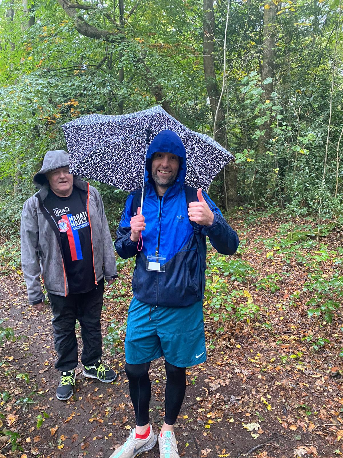 More woodland and more hills. It starts raining, five of us don macs and hoods while JD produces an umbrella from nowhere. He looks like Mary Poppins!