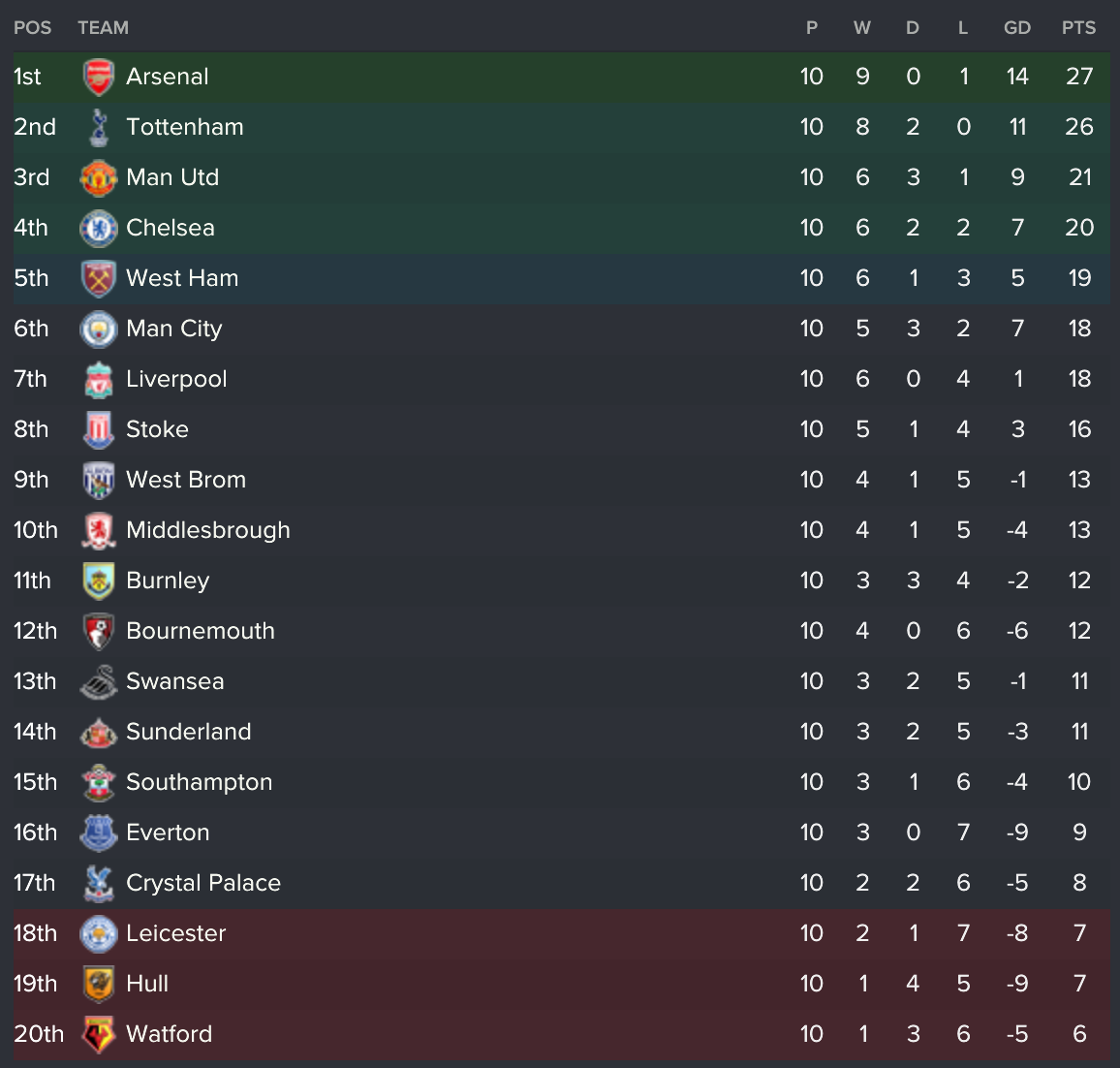 This also brought up the 10 game mark for the Premier League. The table is as below: