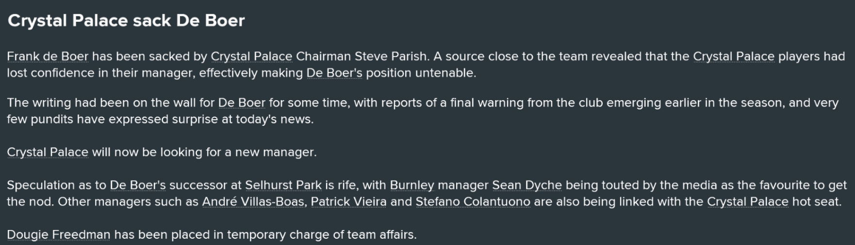 Sadly (for Frank) the loss to Everton dropped Palace into the relegation zone in Everton’s place and enough was enough for Parish. Frank De Boer was sacked just after the defeat. Literally. At 5:52pm.