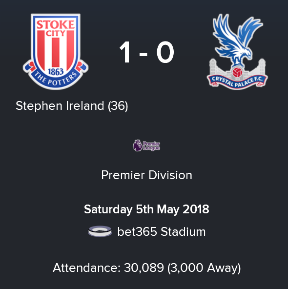 The defeat to Stoke and a win for Swansea meant that Palace dropped to 18th place and into the relegation zone with 1 game remaining and 2 points from safety. Palace had a better goal difference than Swansea however so a draw for Swansea and a win for Palace on the final day of the season would mean that Palace stay up.